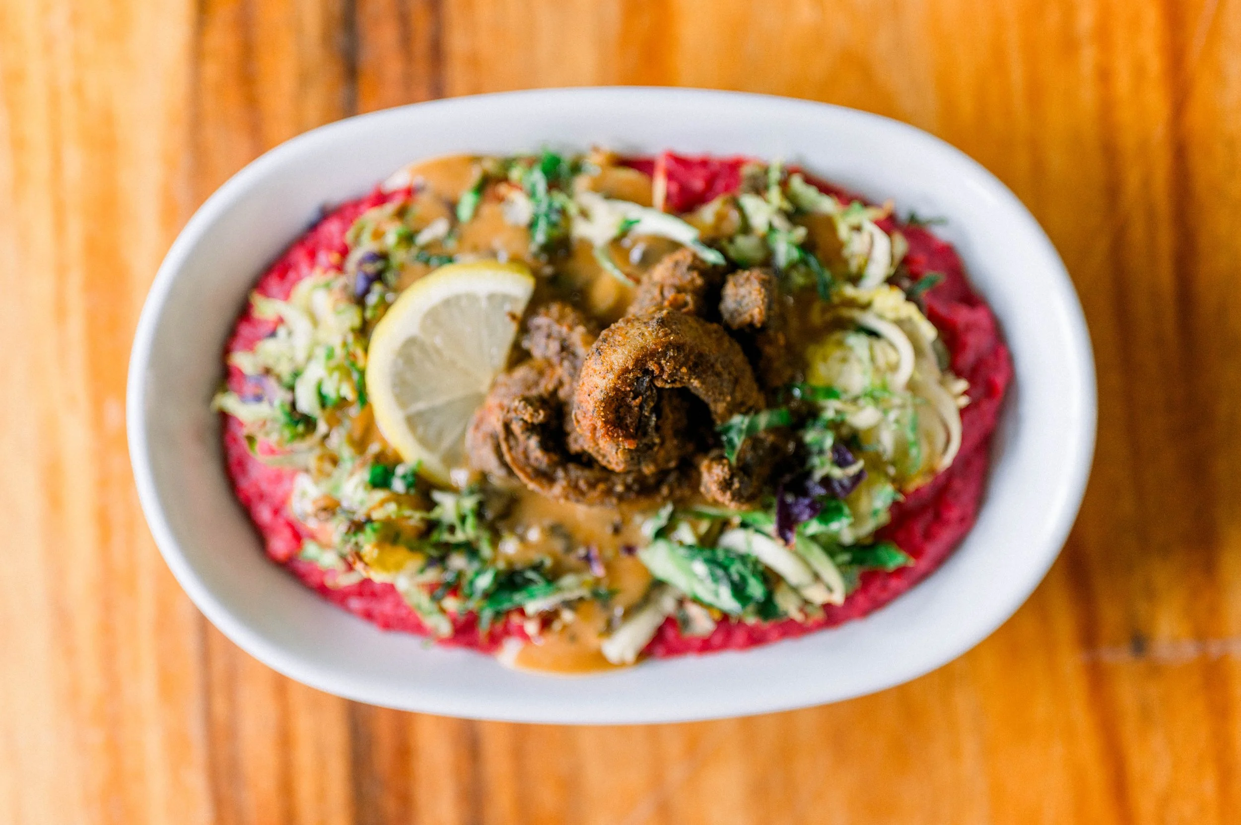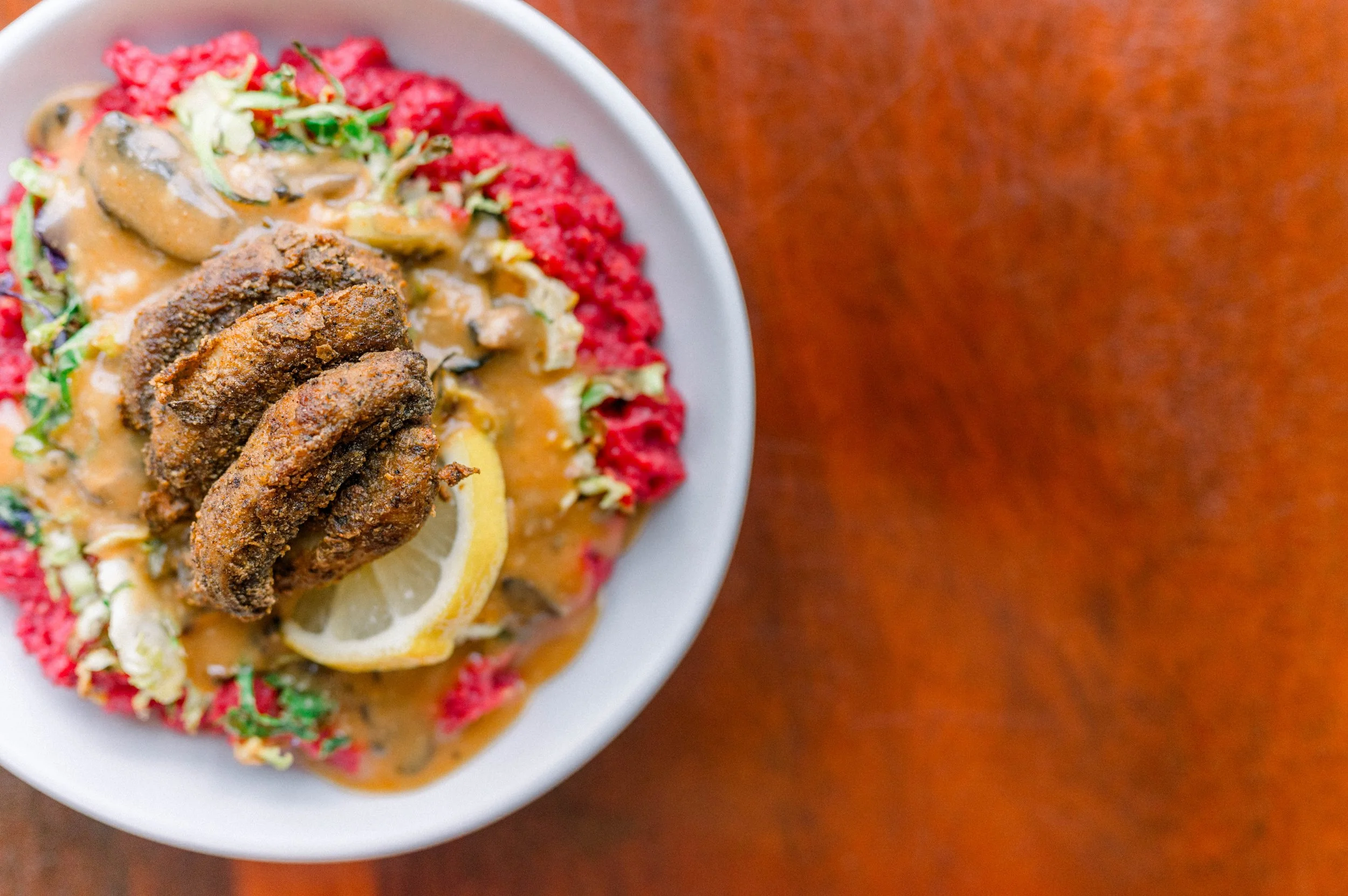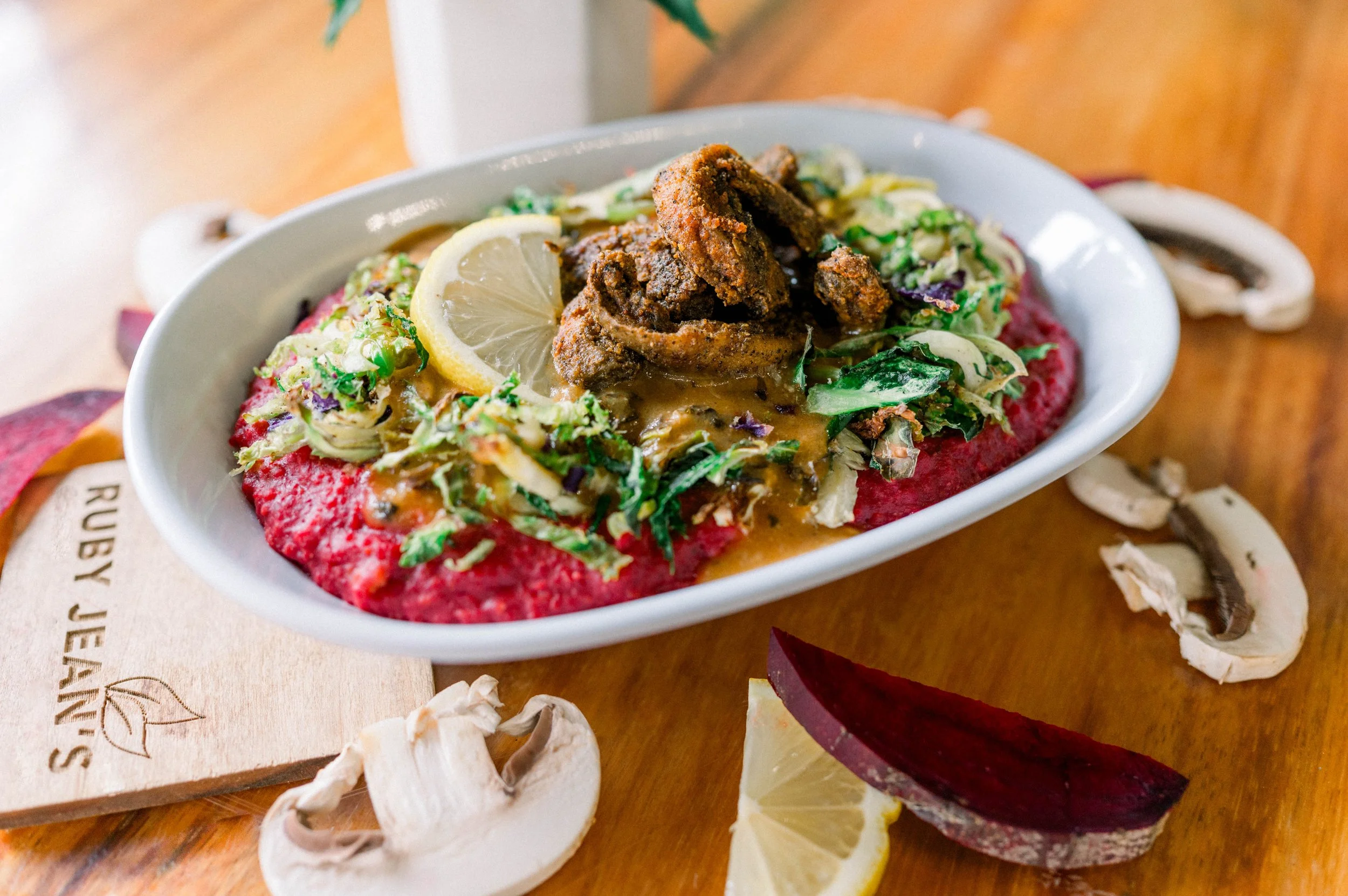 This Black History Month, we honor the Gullah Geechee people with a plant-based take on shrimp & grits—beet + chickpea polenta grits, roasted Brussels slaw, mushroom gravy, and baked shrooms. Limited time only—come taste tradition with a healthy twist!