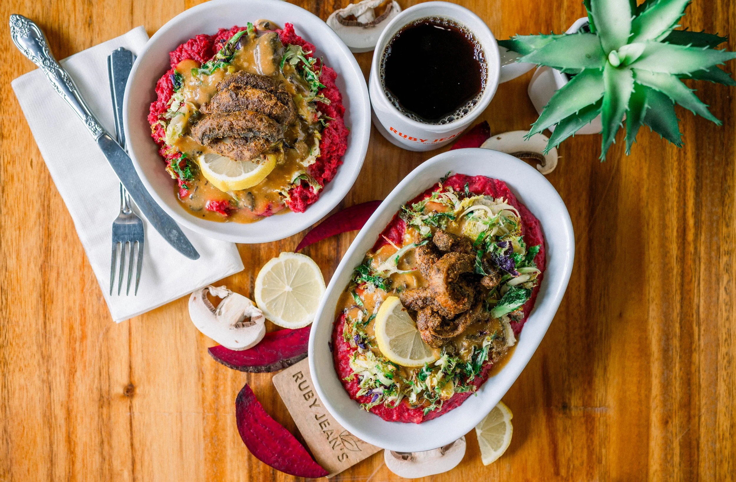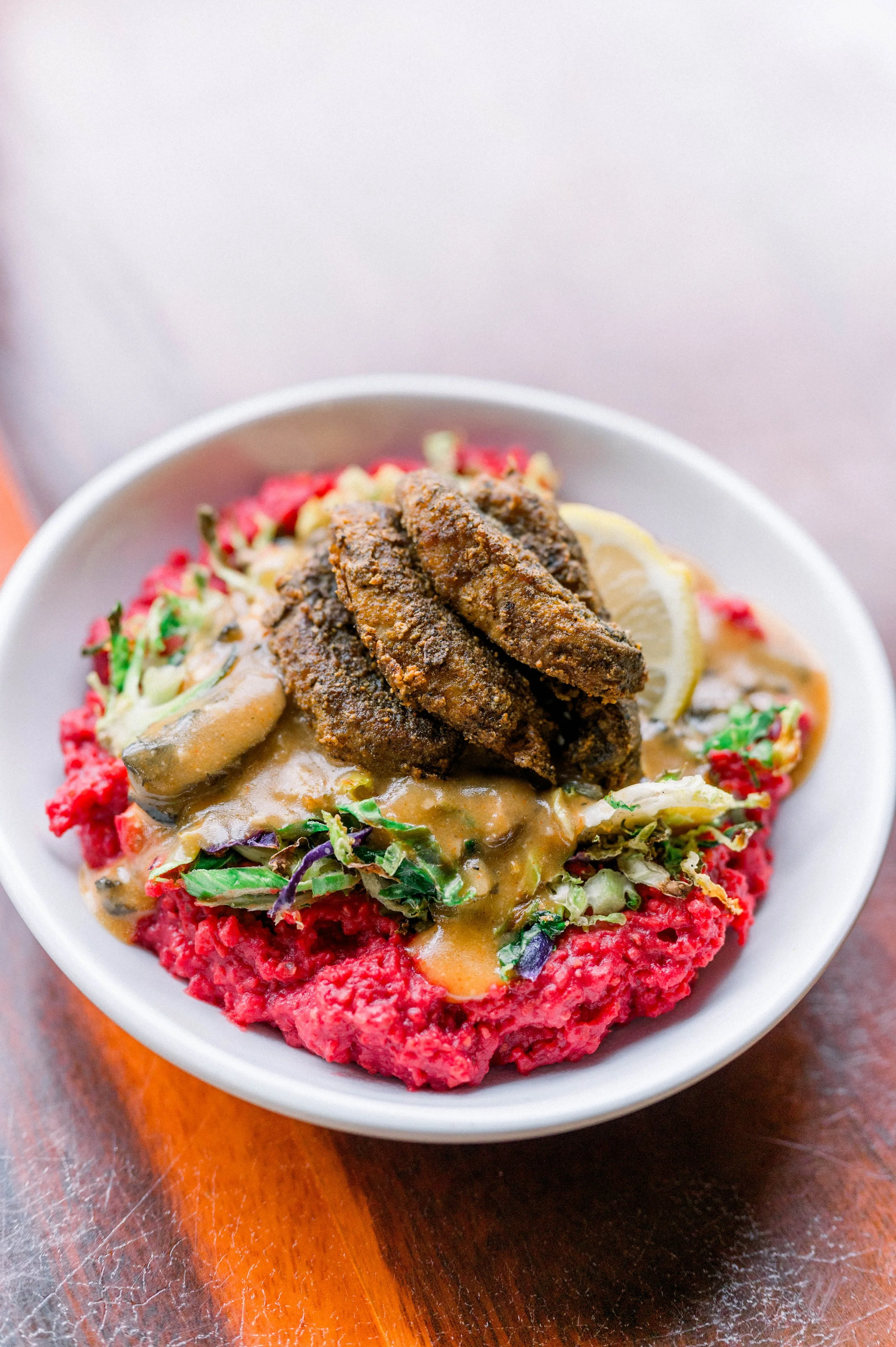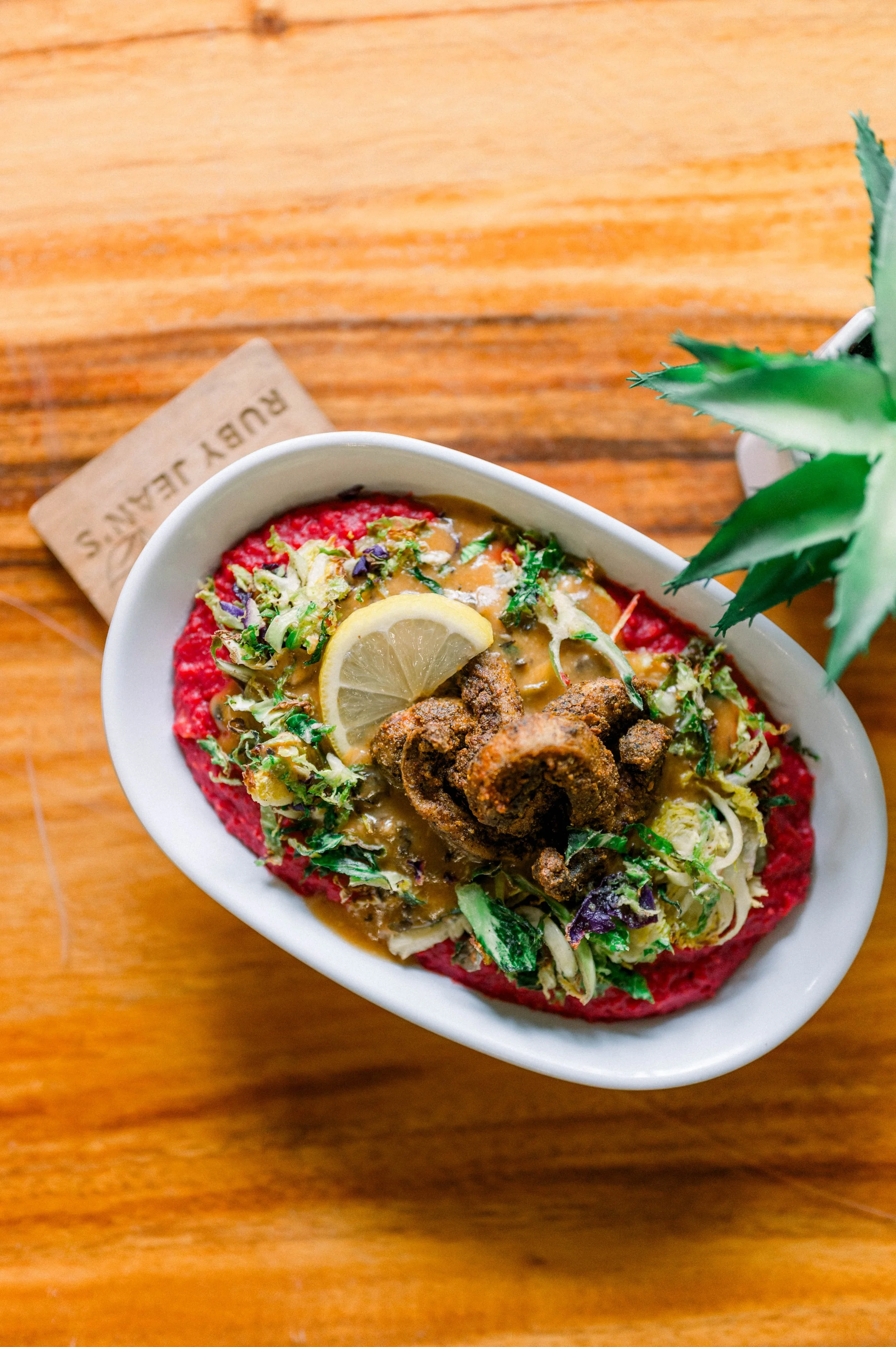 This Black History Month, we honor the Gullah Geechee people with a plant-based take on shrimp & grits—beet + chickpea polenta grits, roasted Brussels slaw, mushroom gravy, and baked shrooms. Limited time only—come taste tradition with a healthy twist!